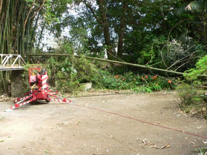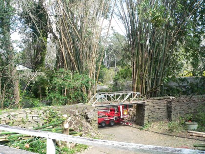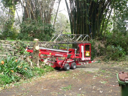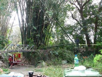 I did try cutting the canes when up in the air but it was far too risky especially if there was any wind. Trees might move in the wind but tall bamboo canes are far worse. Also, any cutting from the lift platform brought the risk that we might drop things on the spider lift.