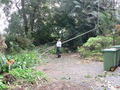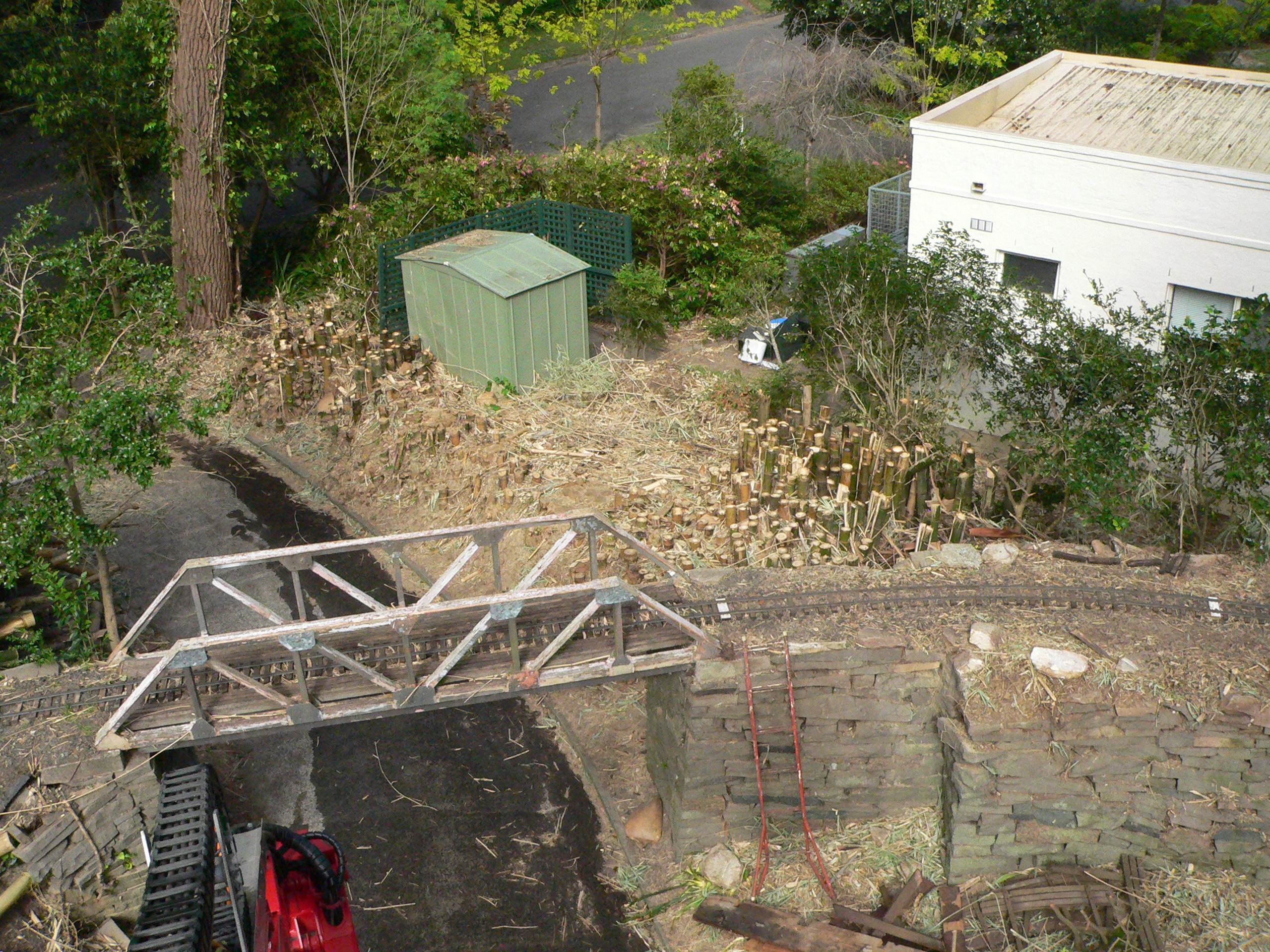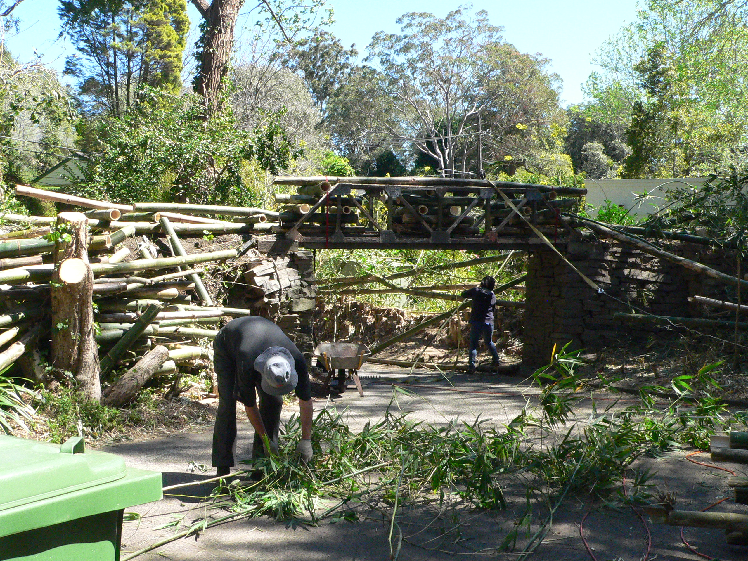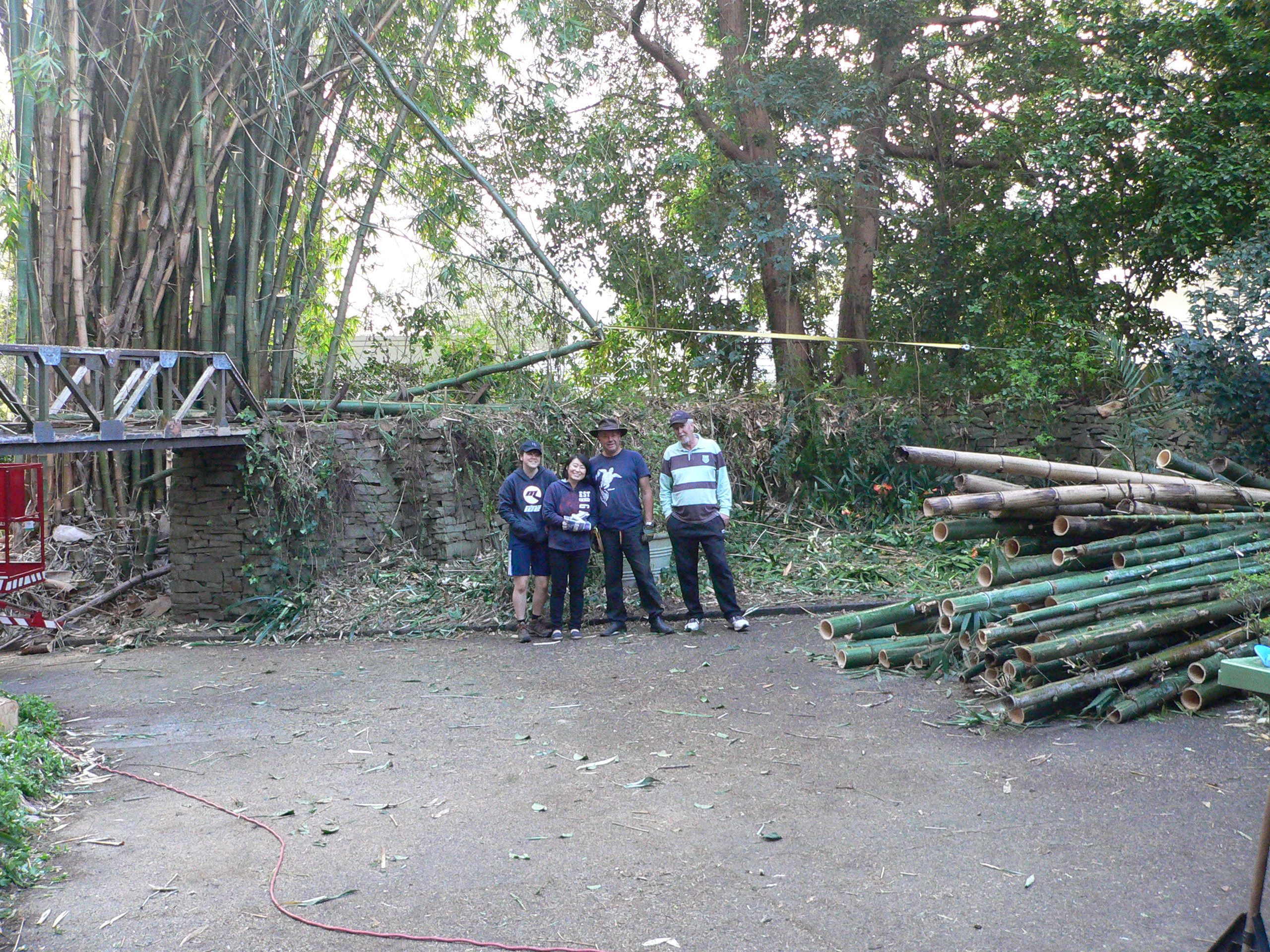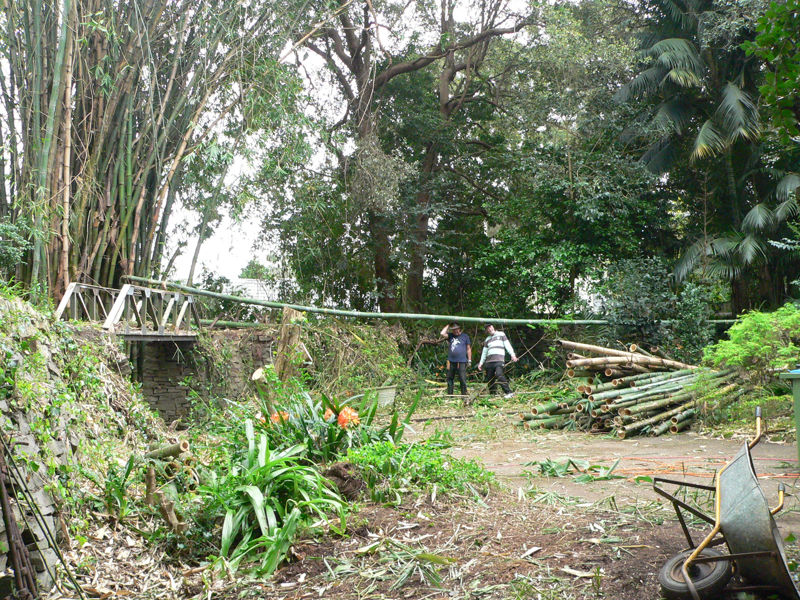 About 50 years ago someone had planted a bamboo plant at the south west corner of the block. This had grown into a large clump of bamboo canes over 20m tall. One of my conditions for buying the property was that the bamboo would be removed. We tried cutting a few canes but they wouldn't fall because all the branches tie the top of the canes to each other. The only way we felled the few test canes was to cut them at ground level, tie a rope to the cane and a car, and drive off.
