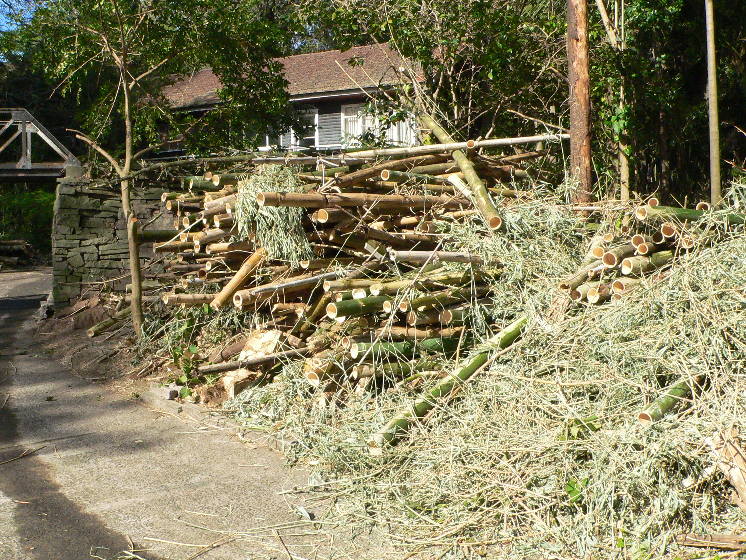 I had over 25 cubic metres of bamboo mulch and some enormous piles of canes cut to about 4m and a large pile of branches and leaves. I hired two 4m skips to clear one of the mulch piles and paid $6k for some tree people to clear most of the canes and branches. A neighbour cleared some of the canes for me which was a great help. A few people took some of the mulch which also helped.