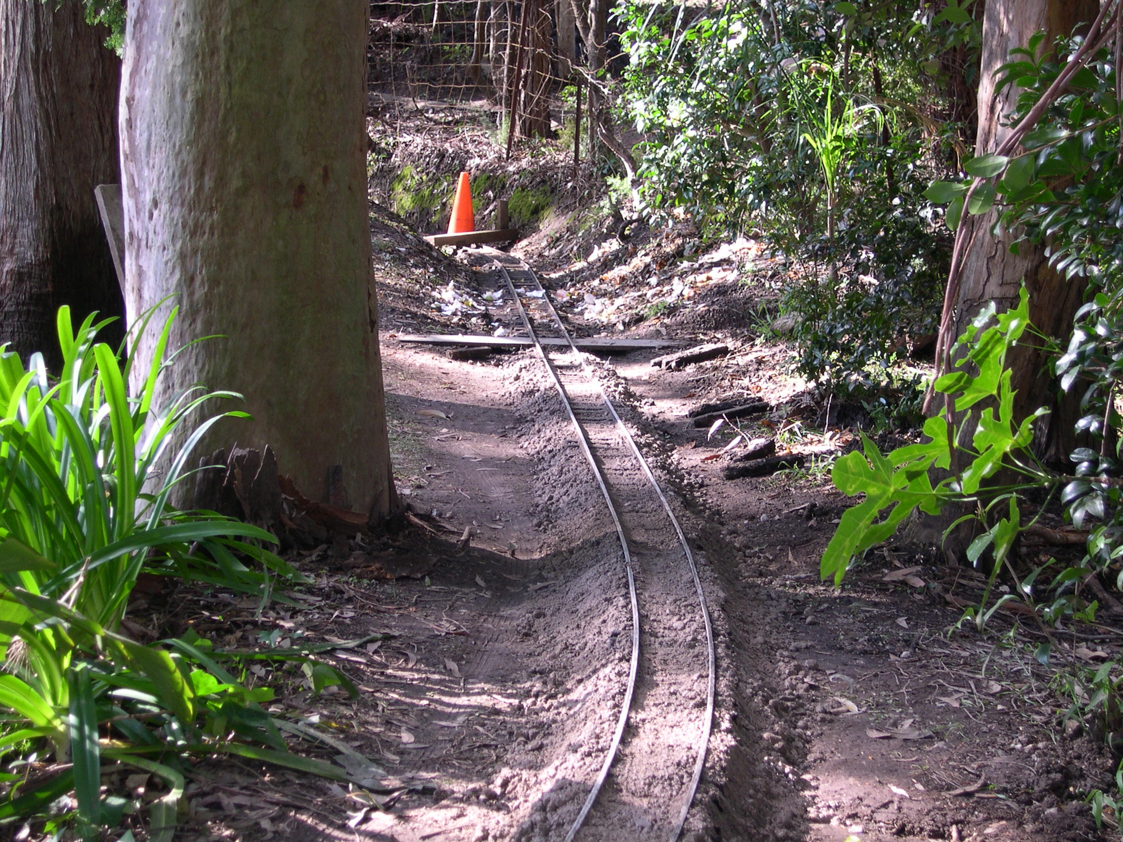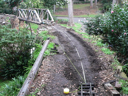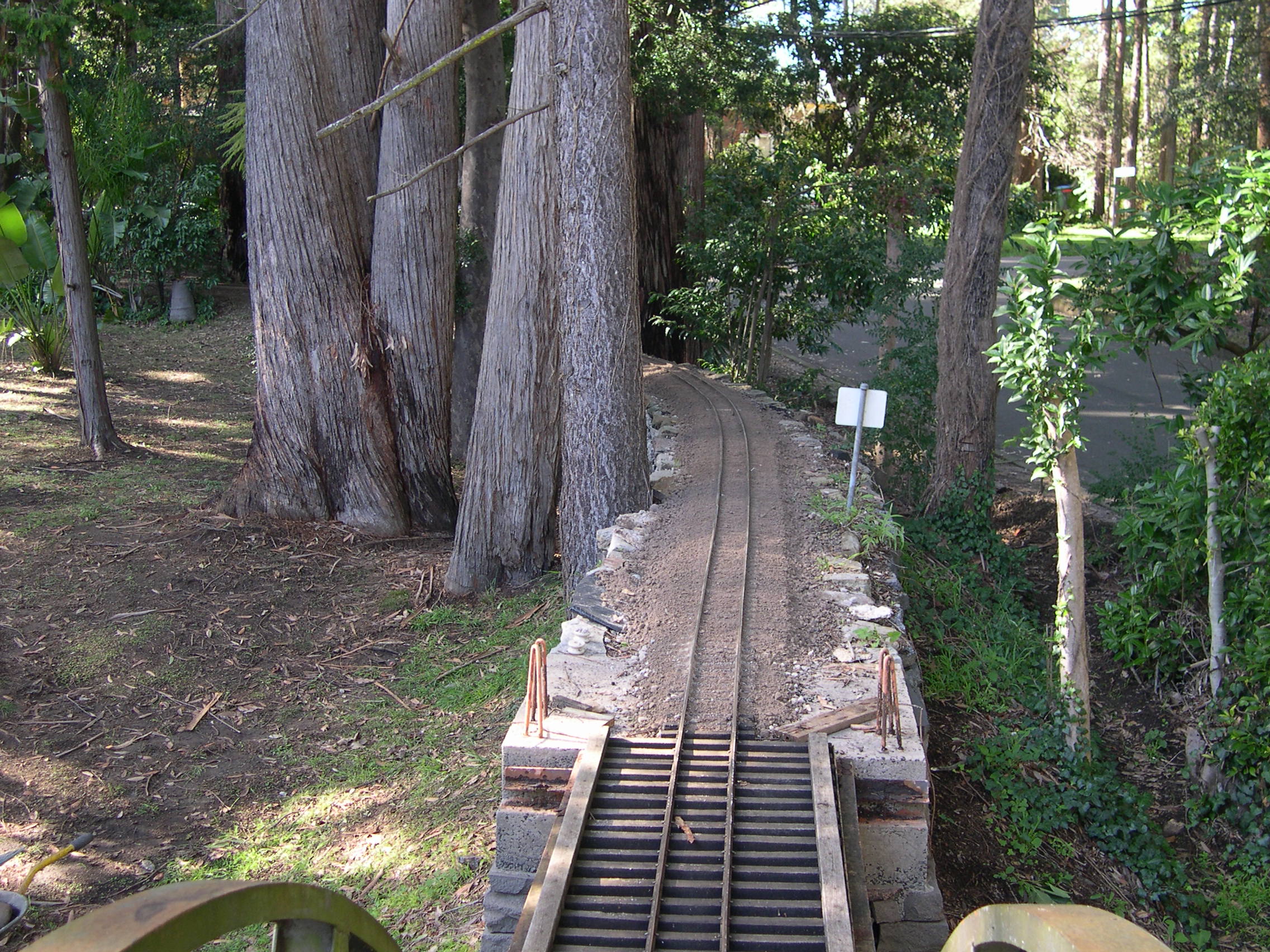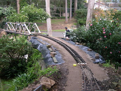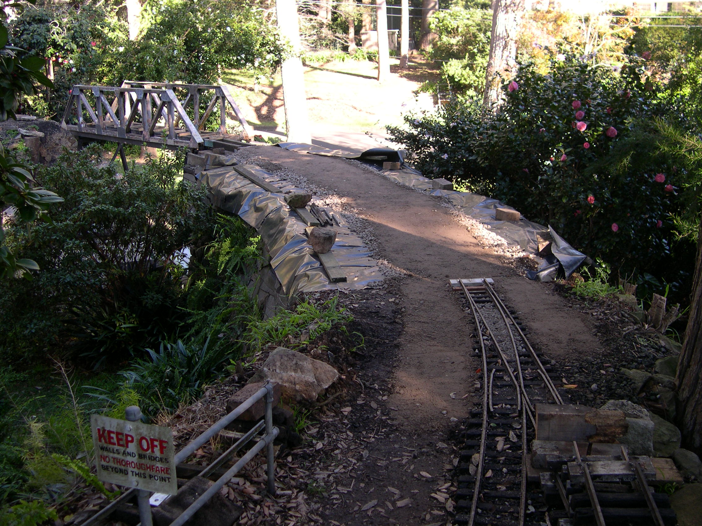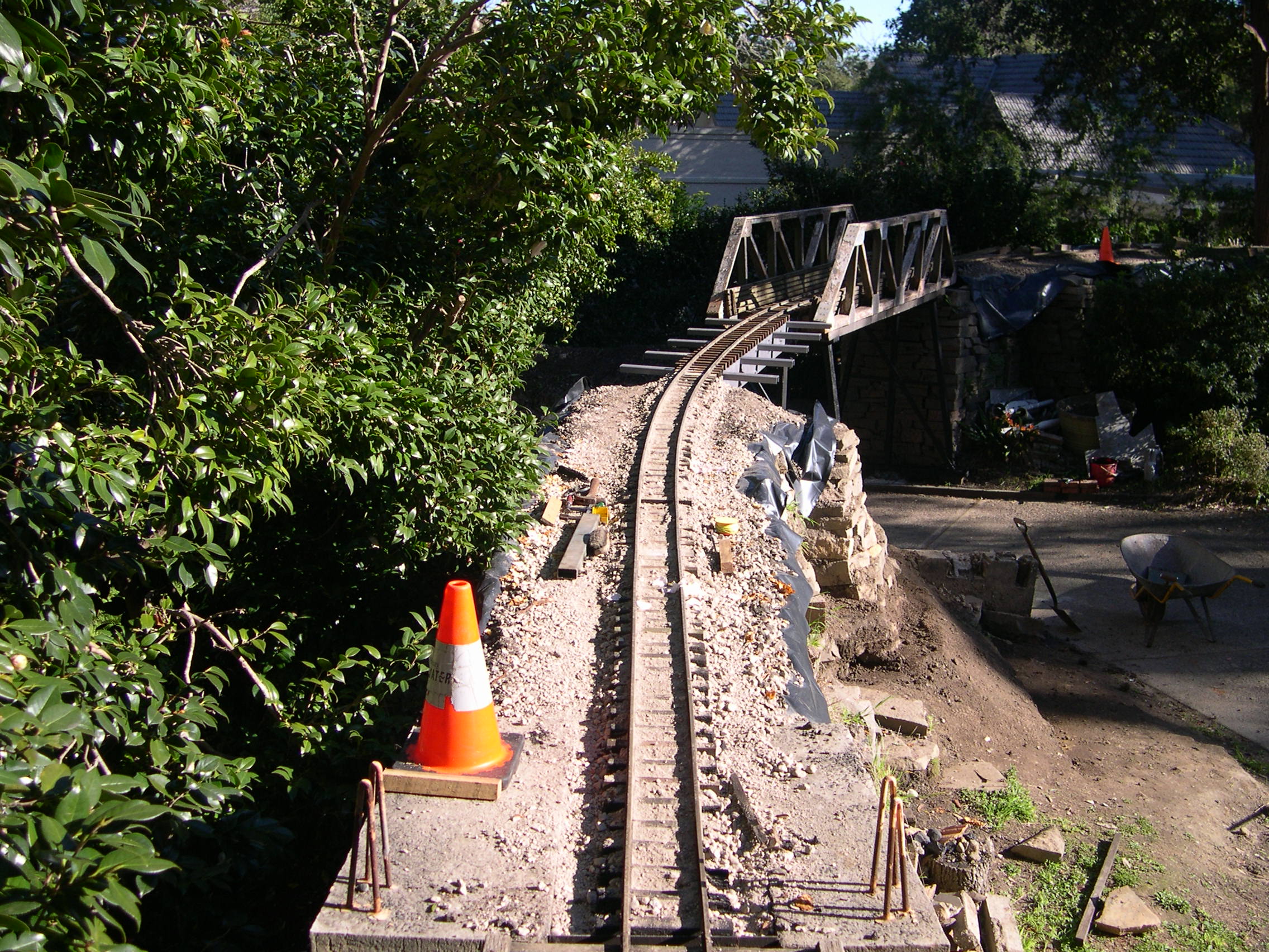 The gradient from the triple bridge to the crest was uneven so after purchasing another 2 tonnes of road base the track was rasied (mostly) and lowered in parts to provide a constant 1 in 92 gradient. The run from the yard to the crest is now 1 in 148 to the triple bridge, 1 in 200 across this bridge, and then 1 in 92 to the crest.