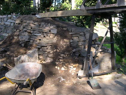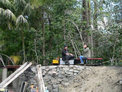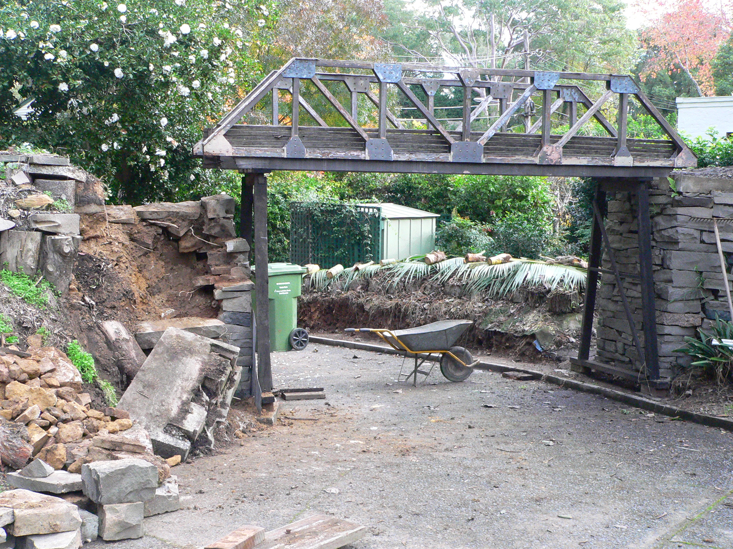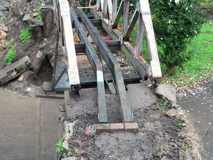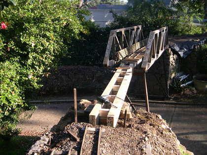 I decided to reduce the height of the embankment here to a stable level. One difficult task was removing the concrete pad (estimated 270kg) that supported the bridge before the trestle bents were installed. For safety I had to support the bridge mid span and remove the adjacent trestle bent in case the end wall of the embankment collapsed. Luckily I did manage to get this mass of concrete down to ground level.