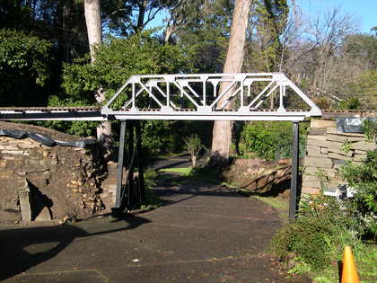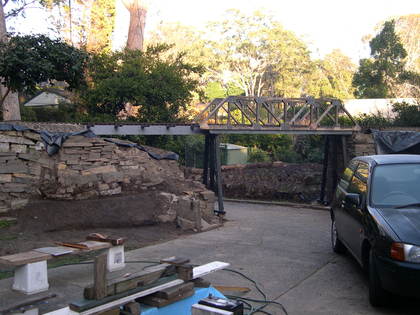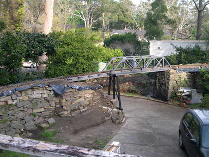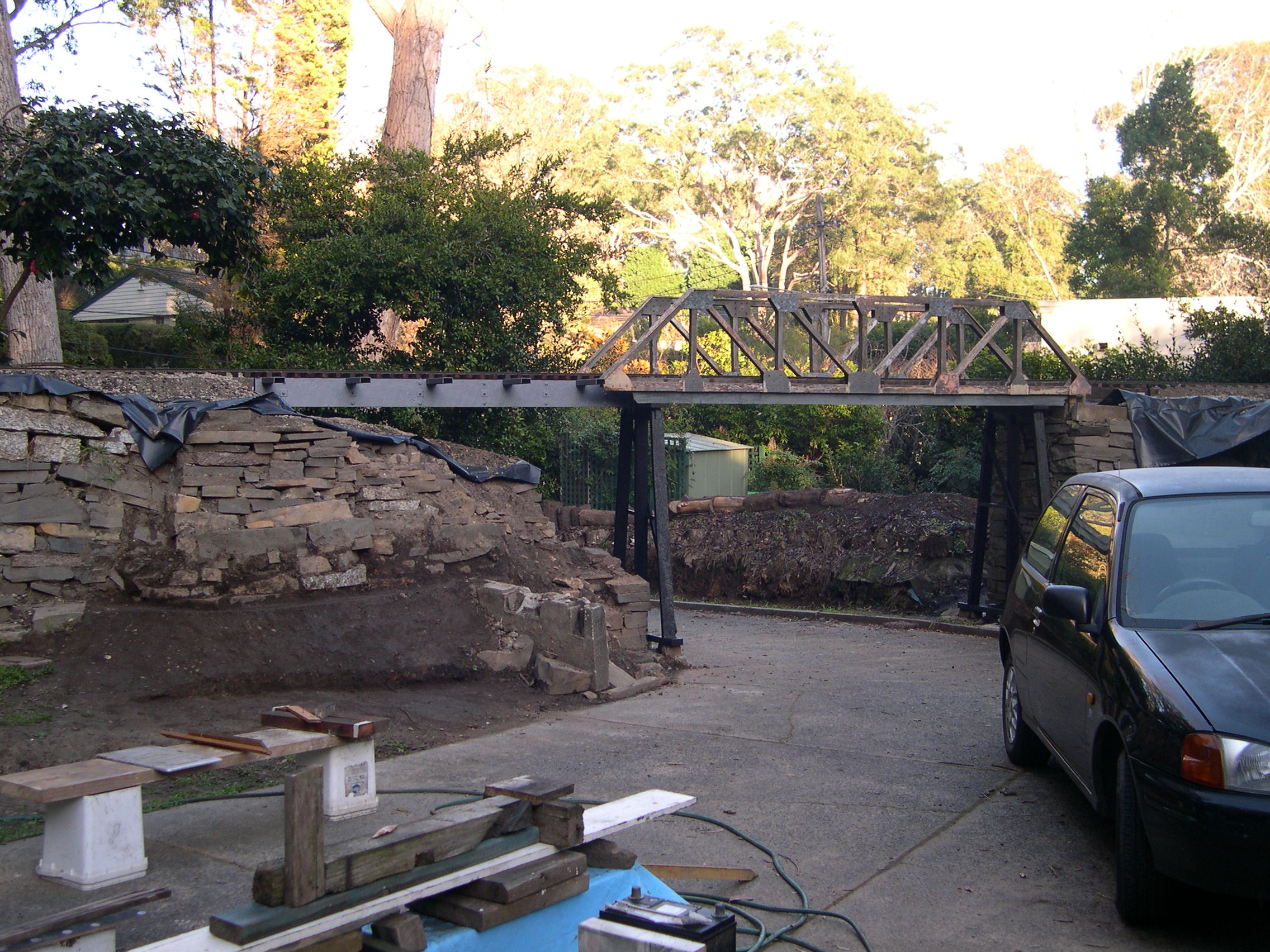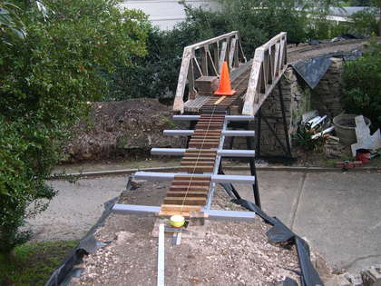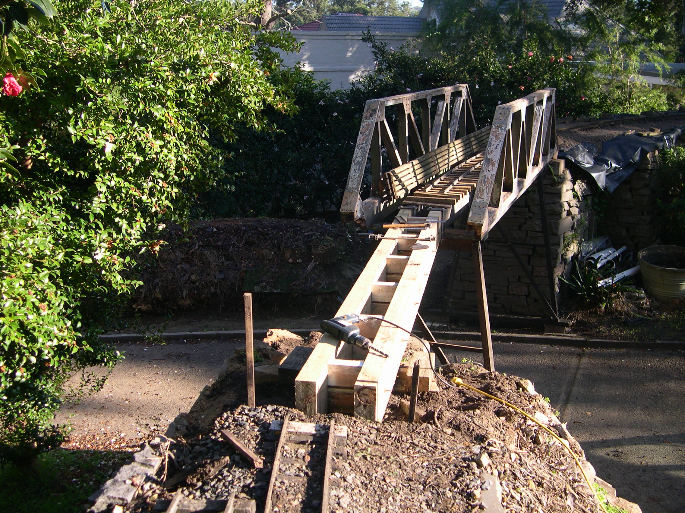 The bridge beams are 7" by 3" hardwood and probably impossible to get now. The eastern extension for this bridge had to be 2.7m long to meet the stable portion of the embankment. I used two 3m lengths of 8" by 3" treated pine for this extension. To support footways here this extension has 3" by 1.5" channel iron. The embankment end is supported on half-stirrups.