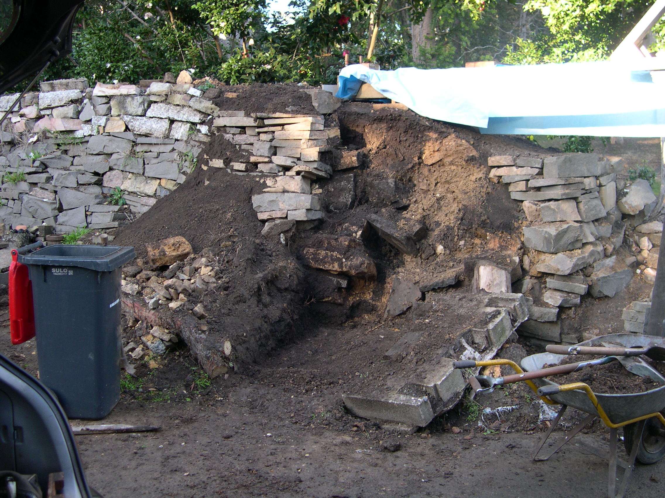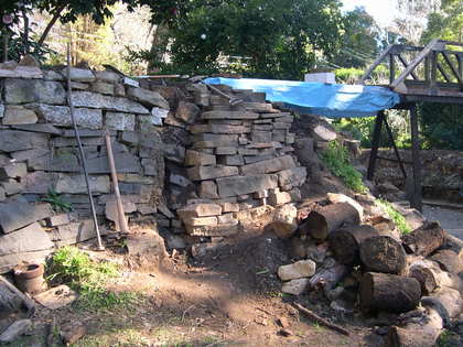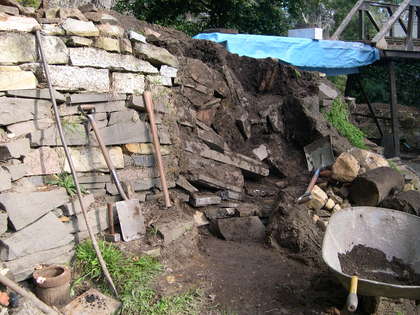 After installing the bridge extension over the partially dismantled embankment the area was cleared as much as could be safely done and the wall rebuilt using the stones and dirt. The top was lowered and plastic added to deflect the water and finally the track bed and track were installed.