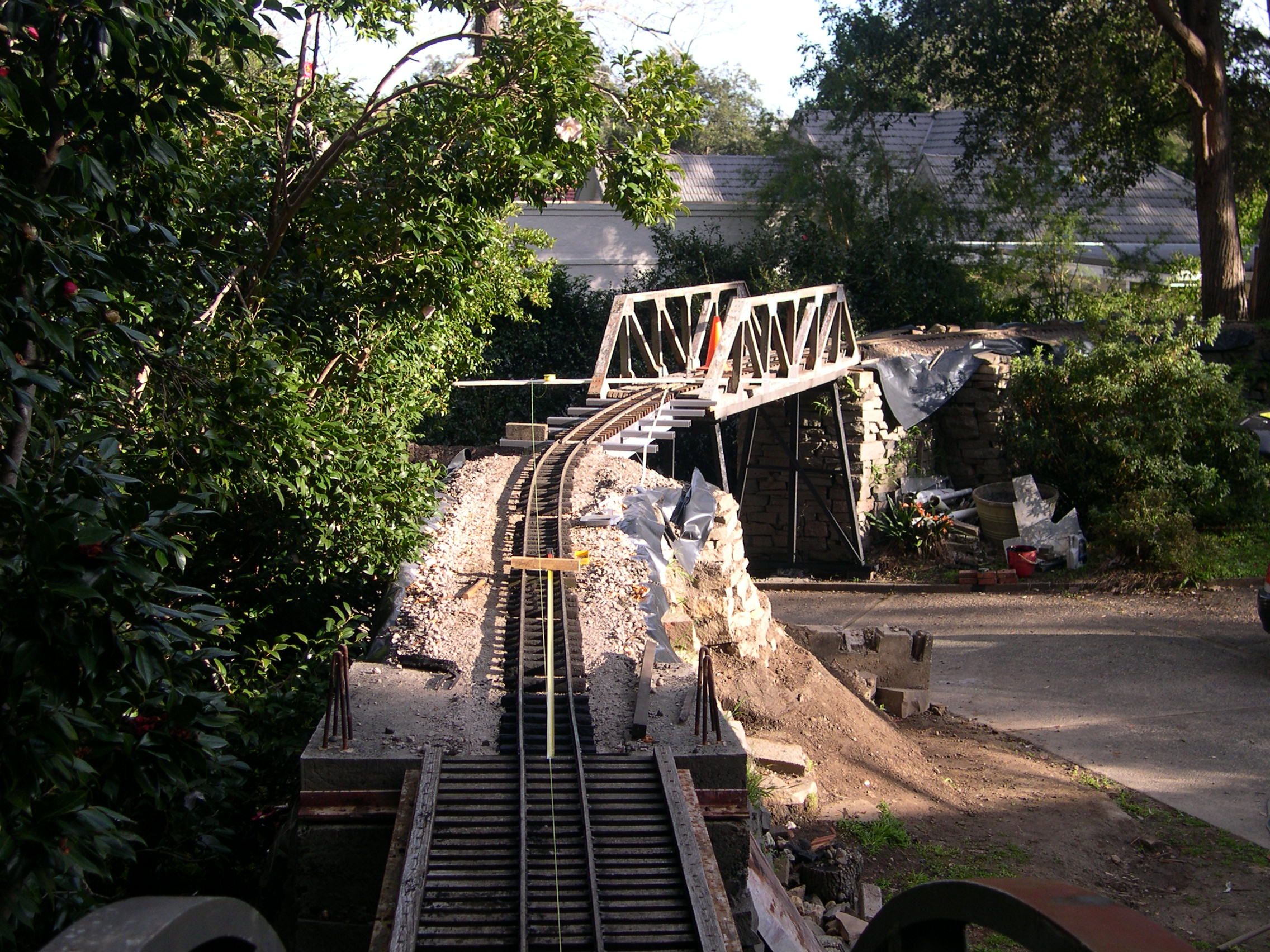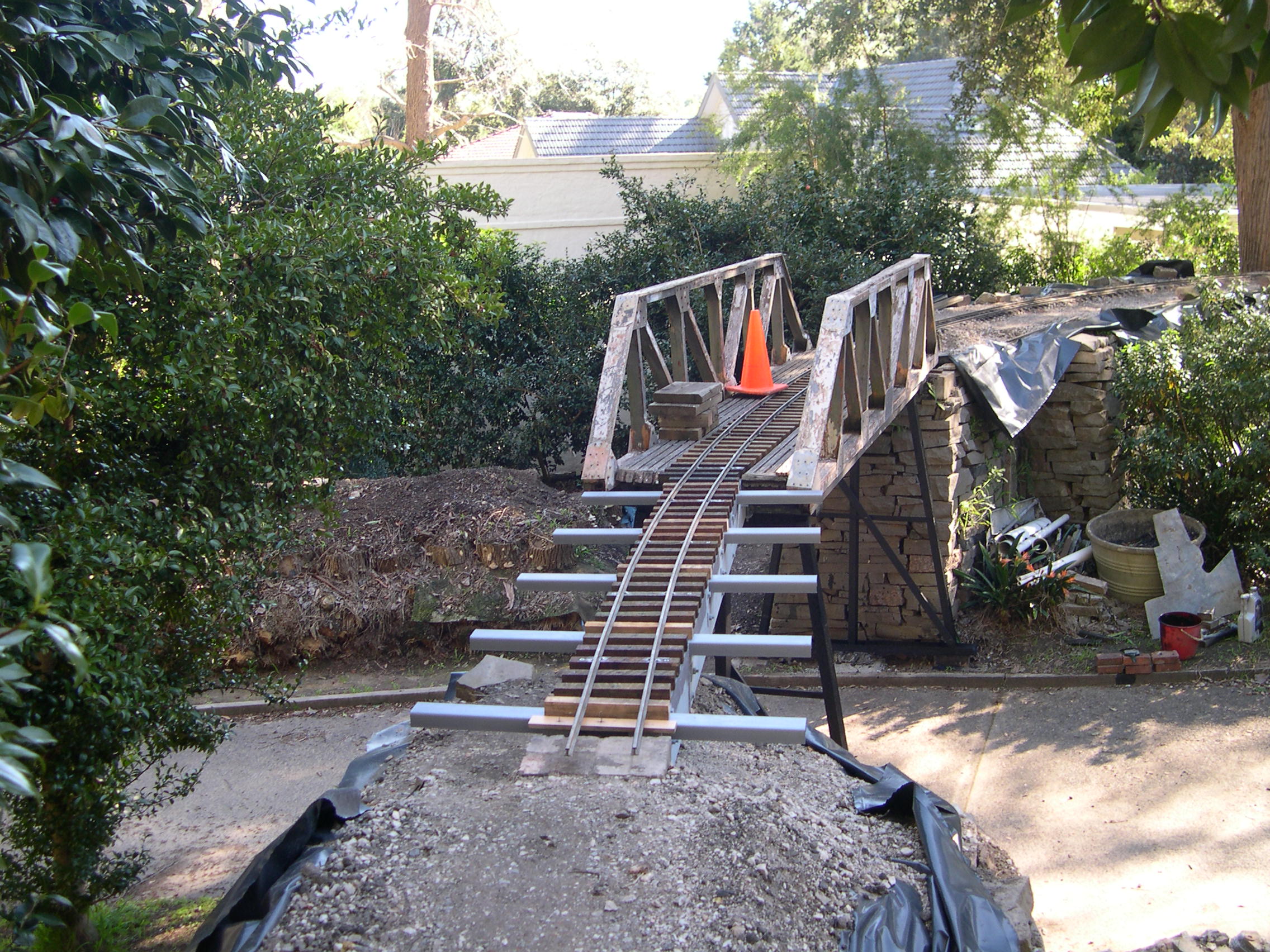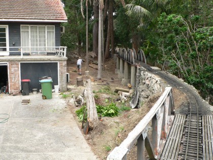 The track near the driveway bridge was always a worry because it is so high and there were sharp curves before and after this bridge. Since one approach was now missing it seemed the perfect time to re-align the track and also even out the gradient in this area. When leaving the main yard the track used to drop slightly to the driveway bridge then rise up to the triple bridge. I calculated this could be changed to a constant 1 in 148 rise from the yard exit turnout to the triple bridge. This required raising the driveway bridge 76mm which was easily done.