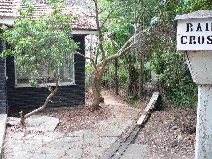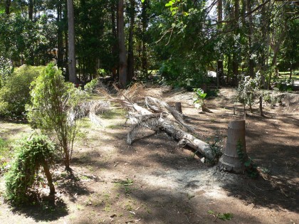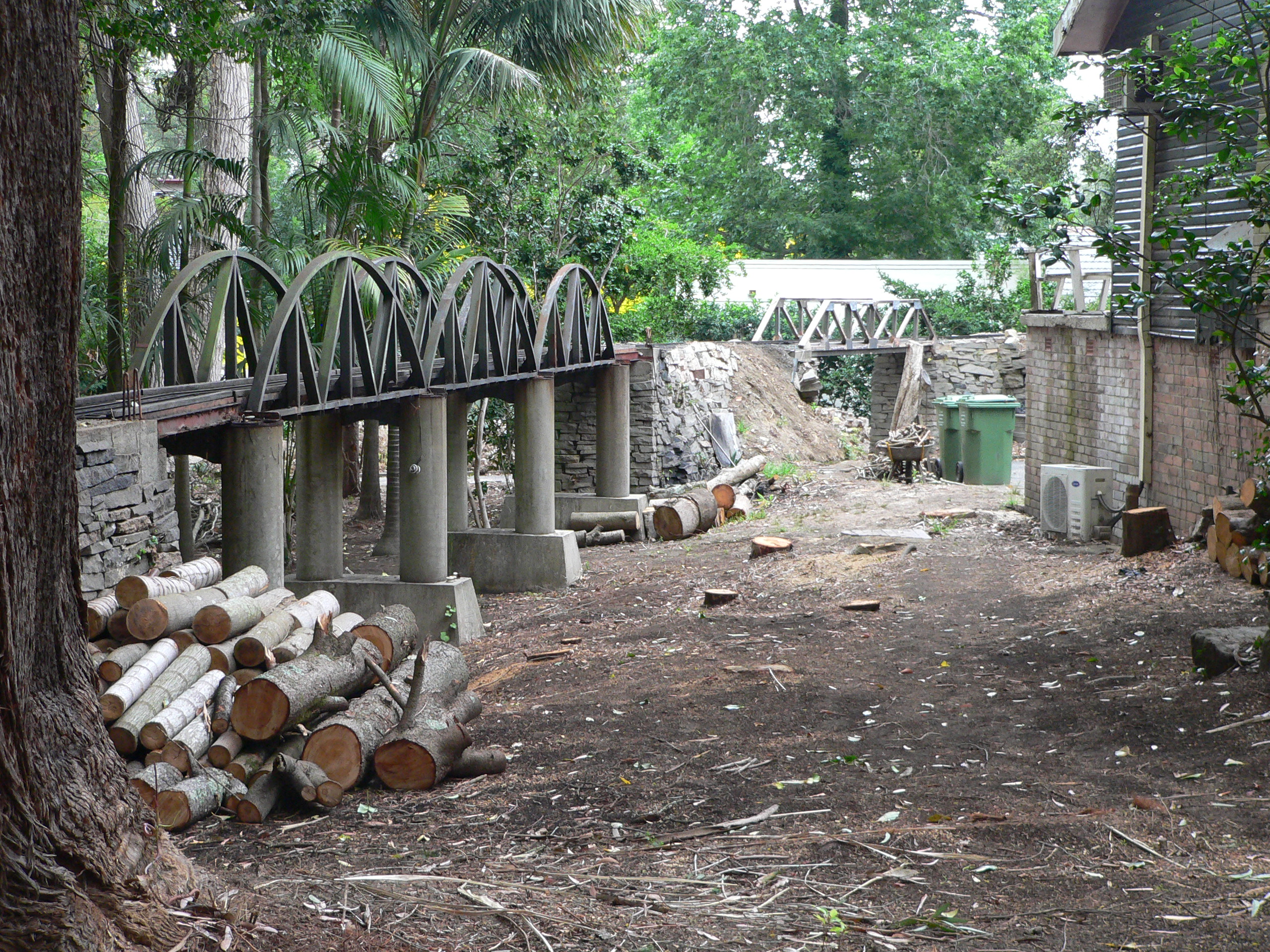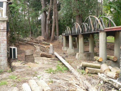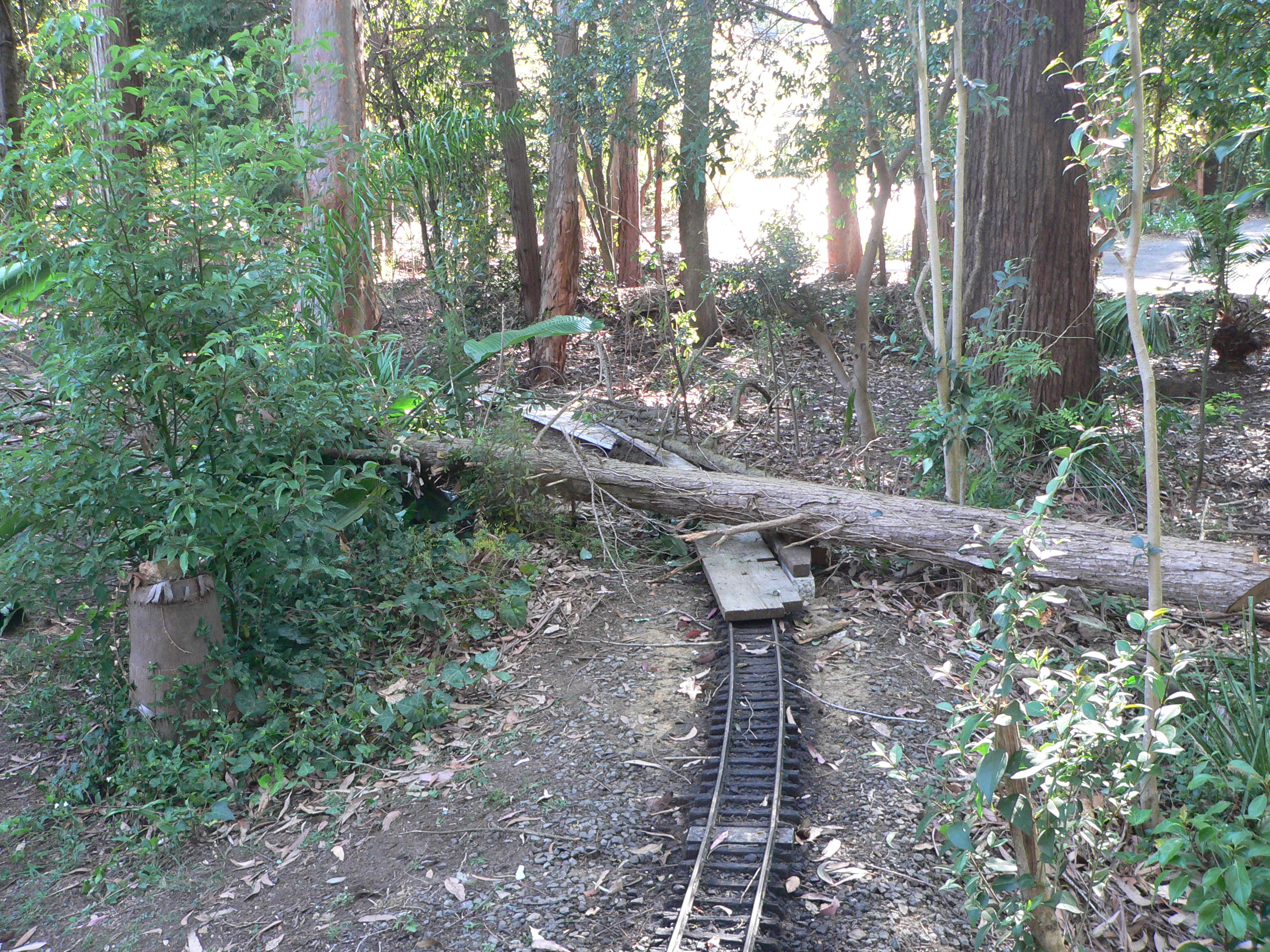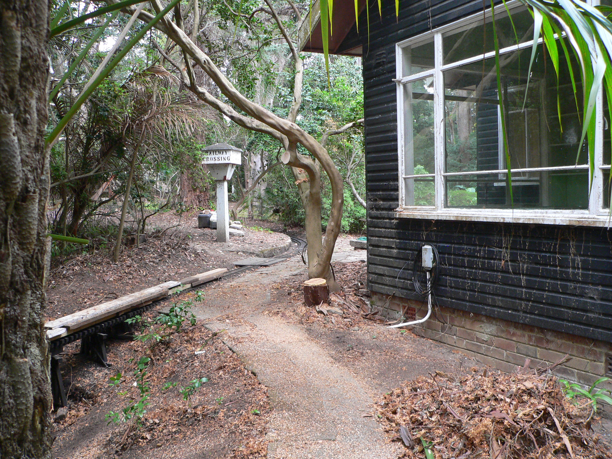 The next week a tree climber visited and cut and dropped the tree near the crossing sign. I'd covered the nearby track with planks in case any bits fell on the track but this was unnecessary as all pieces fell in the small drop zone between the tree and the trestle bridge. There was some damage to the large camellia next to this tree so we had to cut one of its branches.