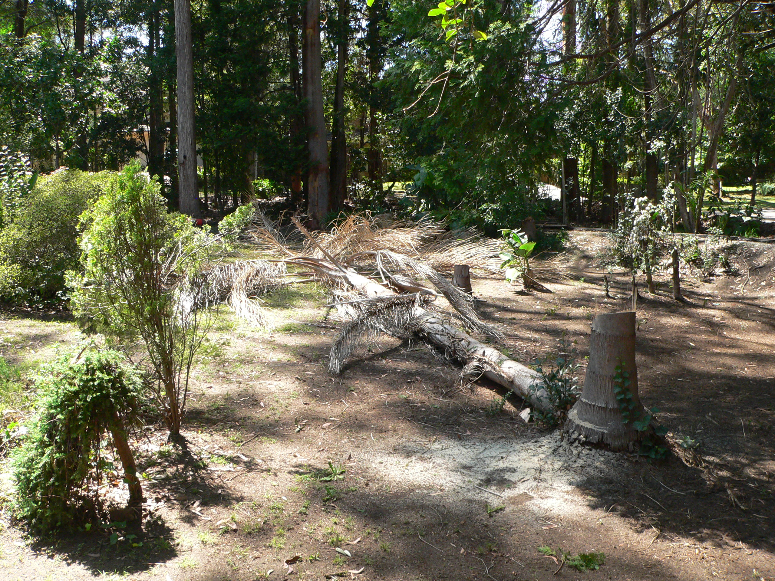 While the climber was here I asked about removing some trees on the south side of the house. Two trees were very close to the house and two more were a little farther away. One was more than 3 metres away but it was dead and okay to remove without council permission. There were also four dead palm trees. The climber removed three of the four trees and then we felled the dead one. The next day I cut the four palm trees and pulled them down with the winch.