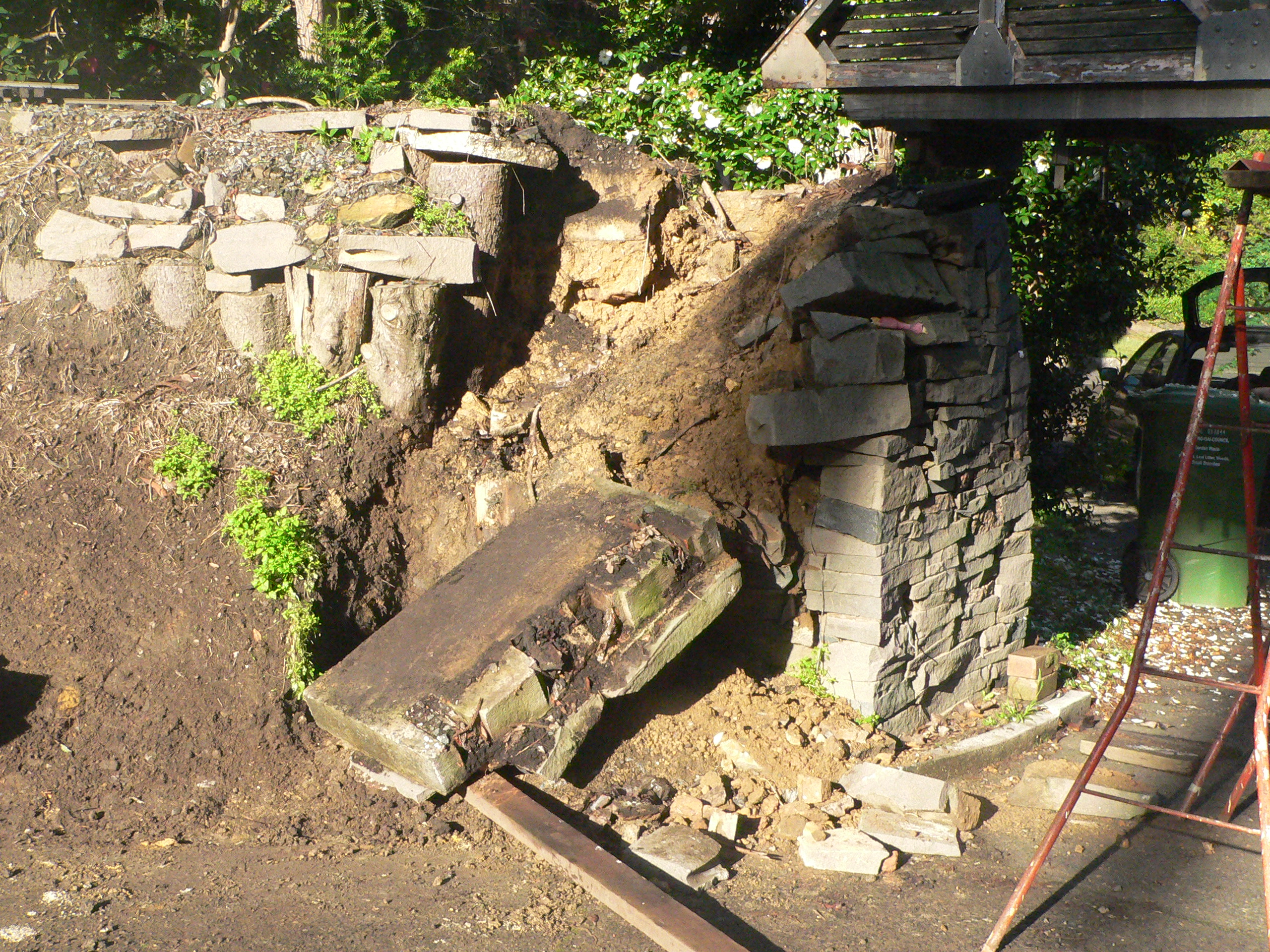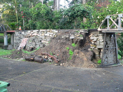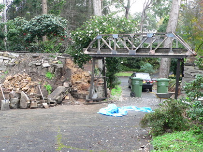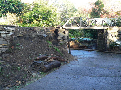 On May 27th we had a landslip next to the driveway bridge. Luckily the bridge is supported by trestle bents and was unaffected. The embankment wall here had collapsed years ago and I'd patched it up using rocks and dirt back in 2016. Later patching also used tree trunk offcuts. The parlous nature of this section of the embankment was well known. I took this latest landslip as a warning that a more serious repair was necessary.