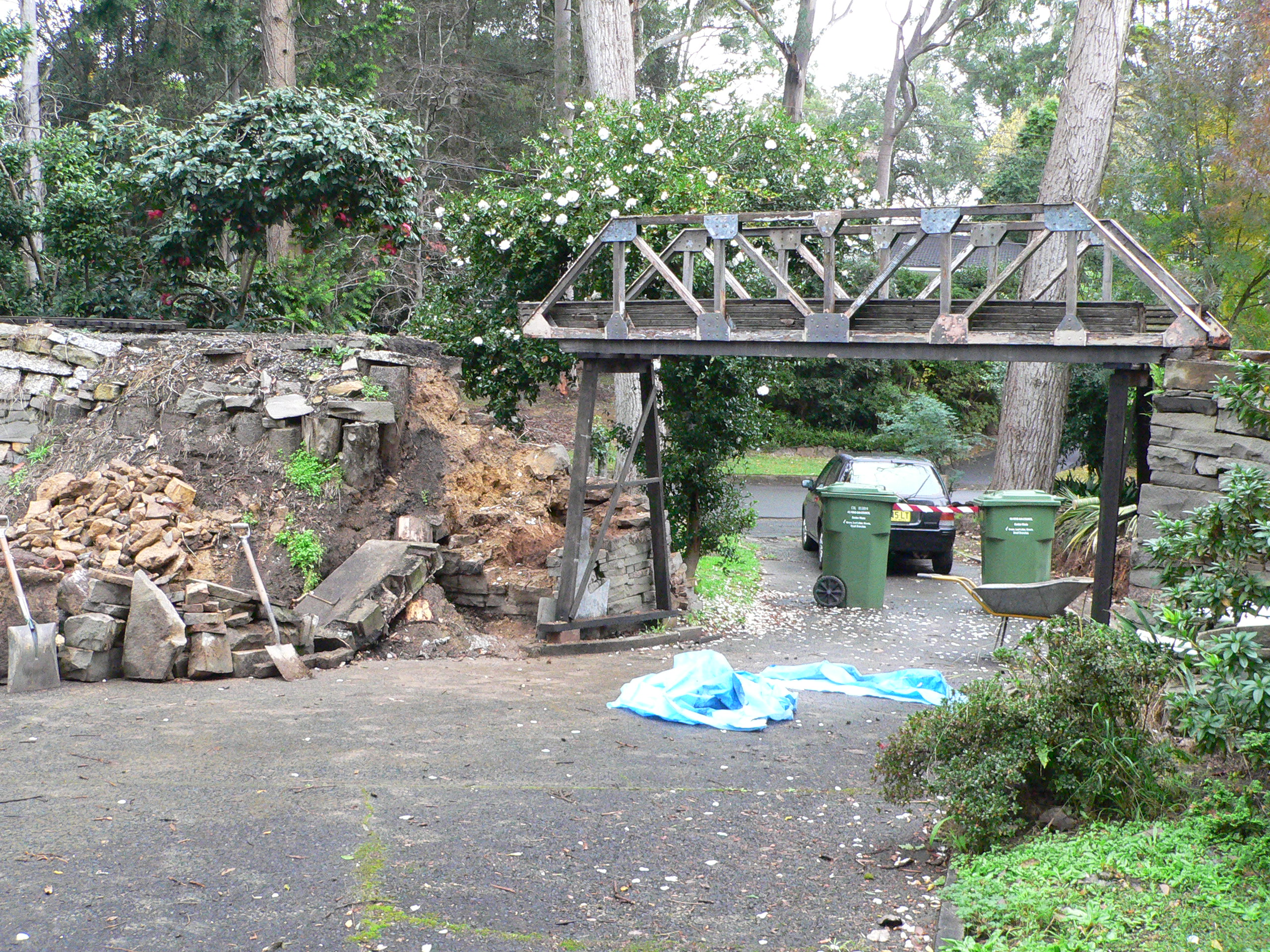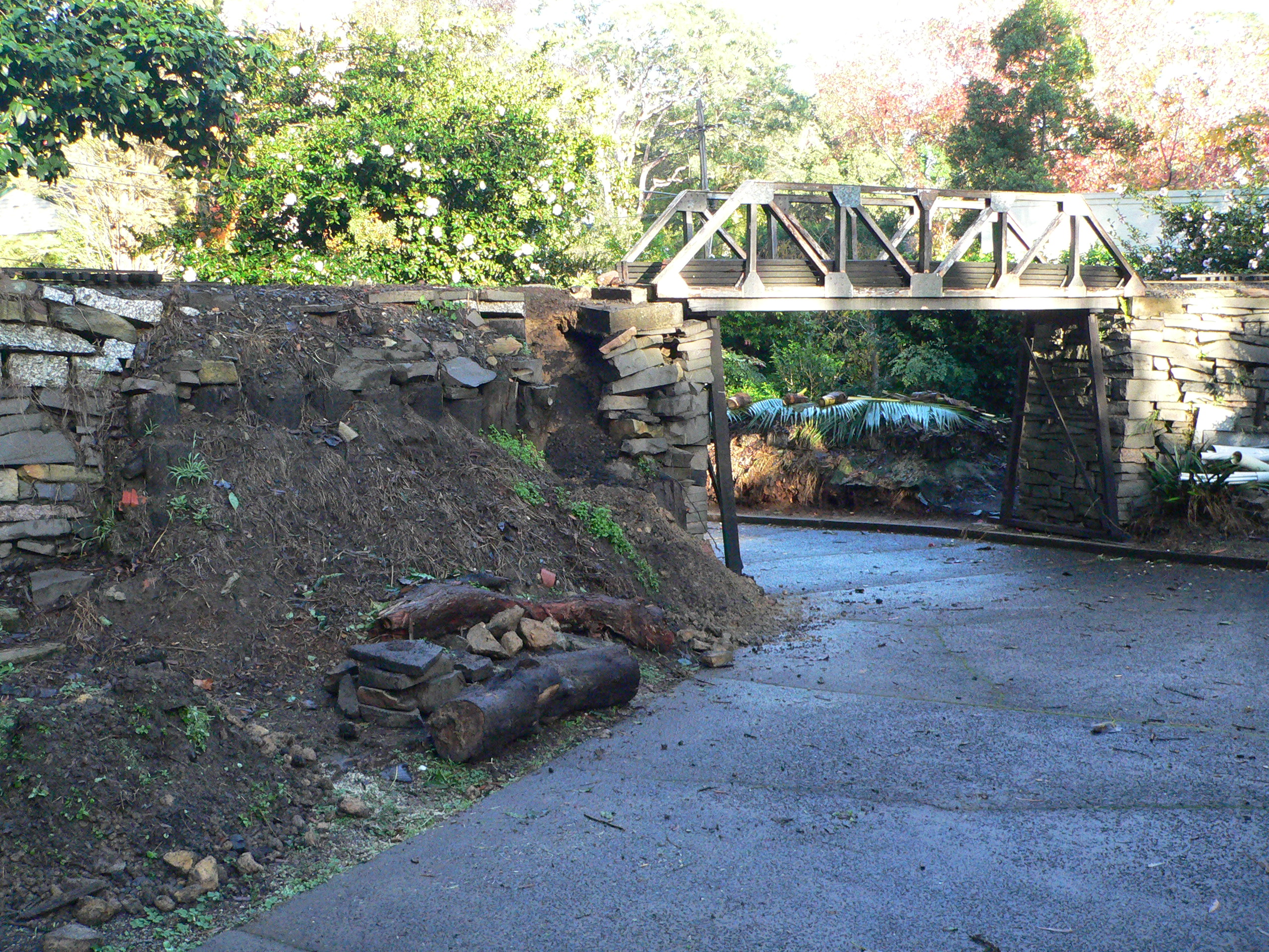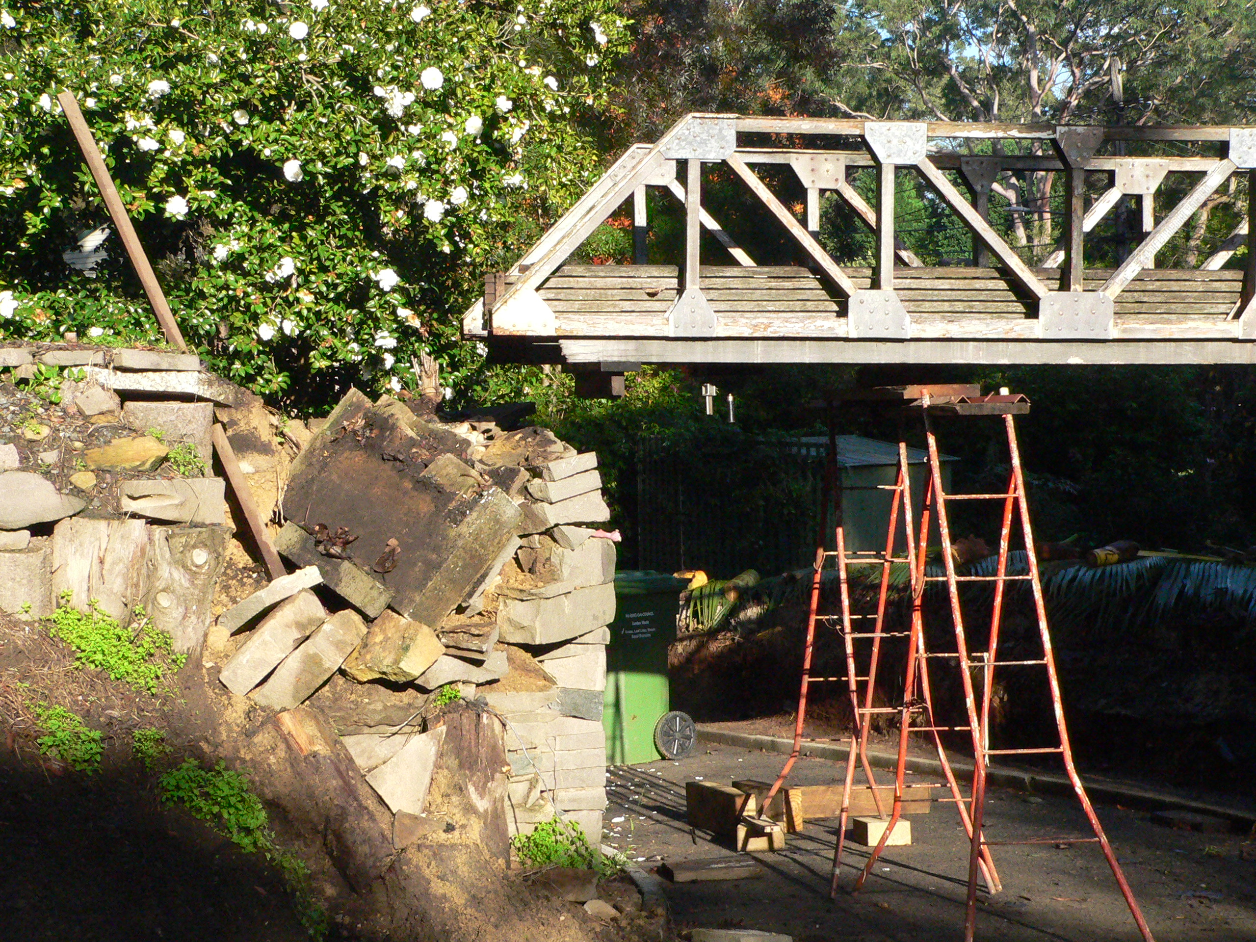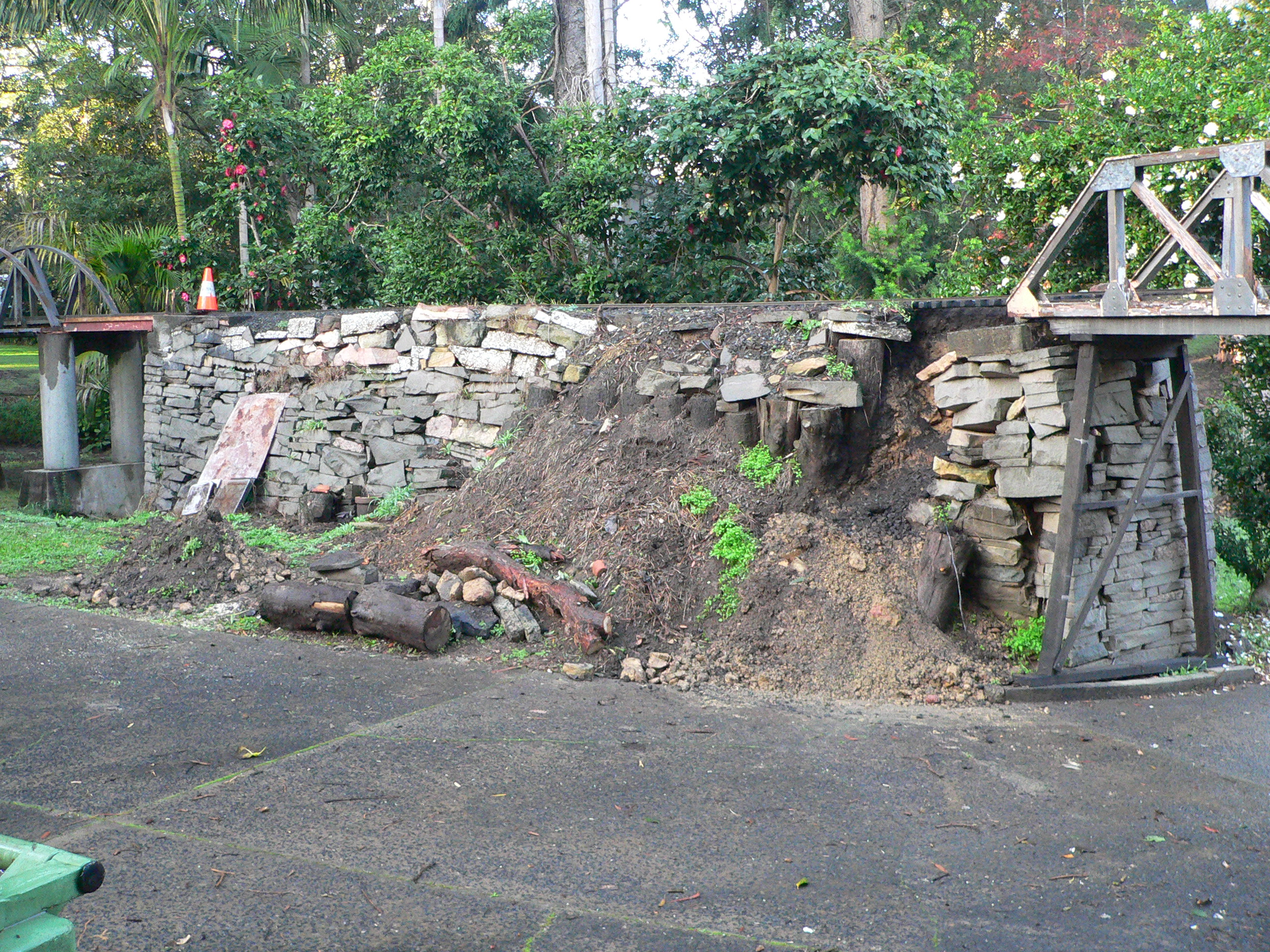 The embankments are dry stone walls (mainly basalt) and filled with clay and whatever dirt was available at the time (1960s ?). The issue with this approach is that the clay expands with water and can bulge the walls. This is more pronounced in the bridge area due to the height of the embankments here. The height and weight of the embankments means that maintenance is difficult. Also, the inward lean on the outer wall means it will probably collapse inward if the rest of the embankment is removed. This meant that removing the collapsed area for a total rebuild was not an option unless the outer wall was also brought down.