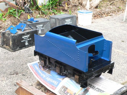 The original idea was to clean the loco and brush paint using KBS paints which flow well and hide most brush marks. Then we decided to dismantle the tender so I could clean and paint the rusty inside surfaces. Paint stripping went well because we used paint stripper in a spray bottle. Cleaning and phosphating and rinsing completed this stage.